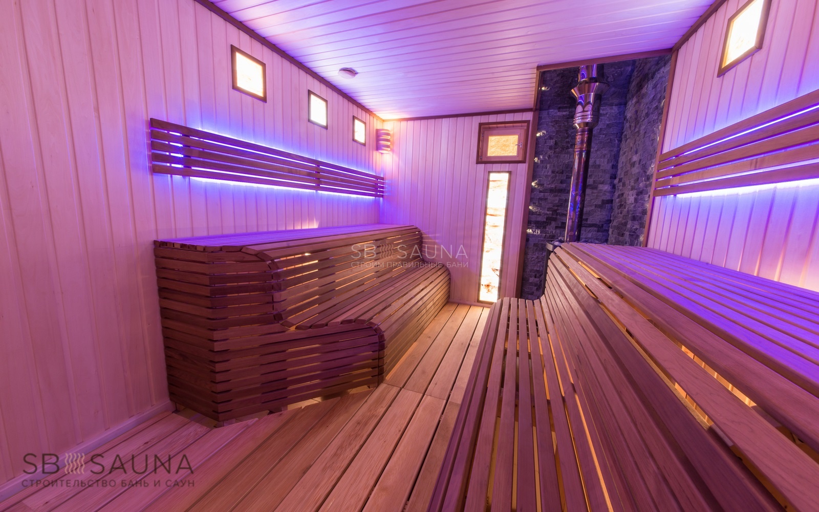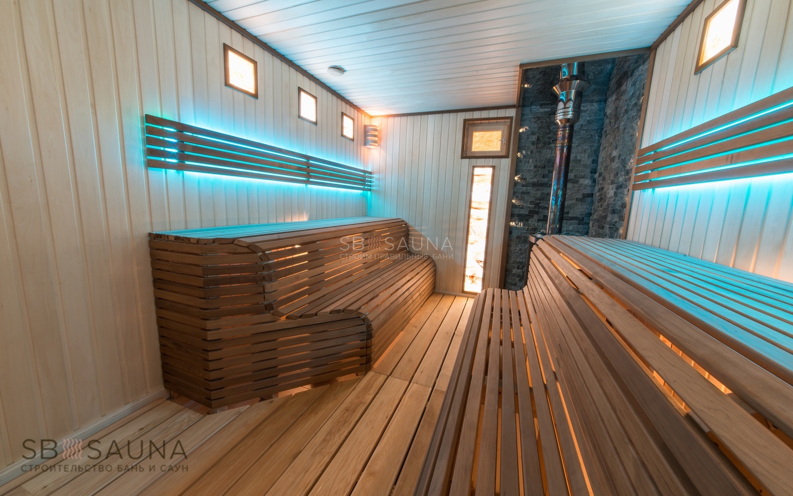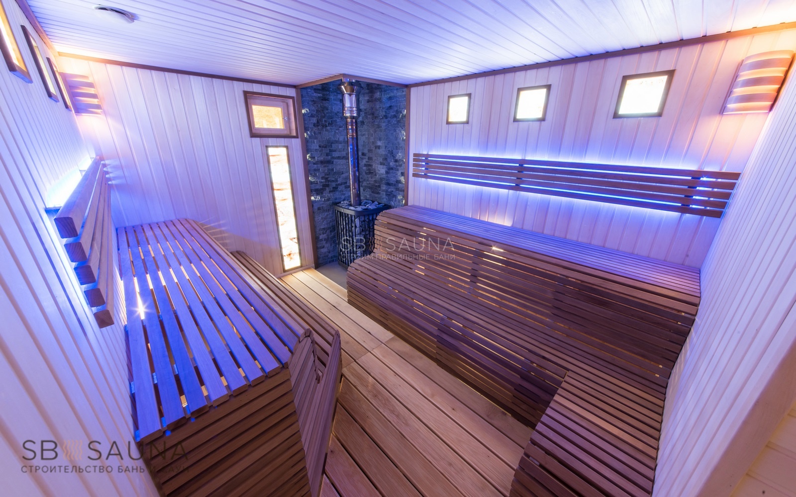 Обратите внимание на уникальность использования палатьев анатомического типа при строительстве данной финской сауны. Завершающим акцентом стало использование светодиодной подсветки и оптоволокна Cariitti.