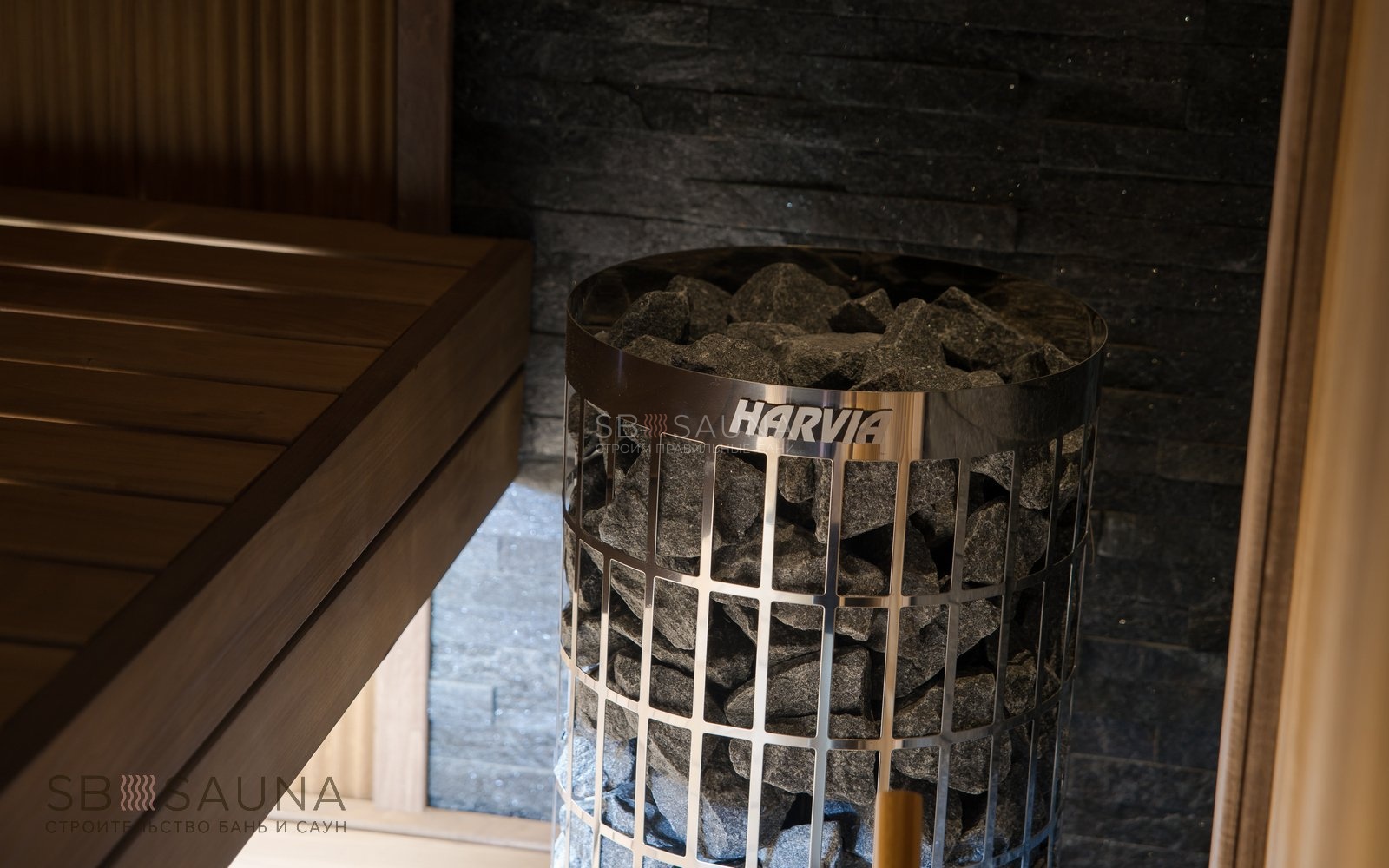 Печь Harvia Cilindro - удачный выбор для компактных саун, так как ее можно встраивать в полок, что позволяет сэкономить еще больше места. Печной угол из натурального сланца делает сауну в квартире полностью безопасной. А комплект освещения Cariitti VPL10L-E161 создает уют и дополнительно подчеркивает нестандартную волнистую поверхность стен.