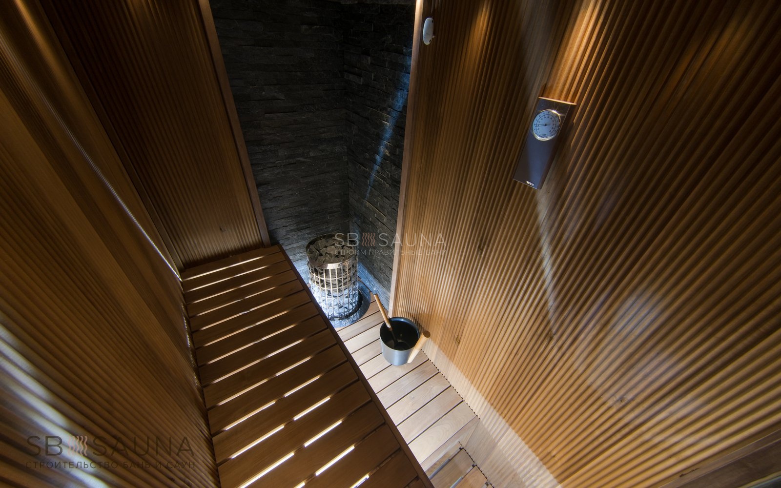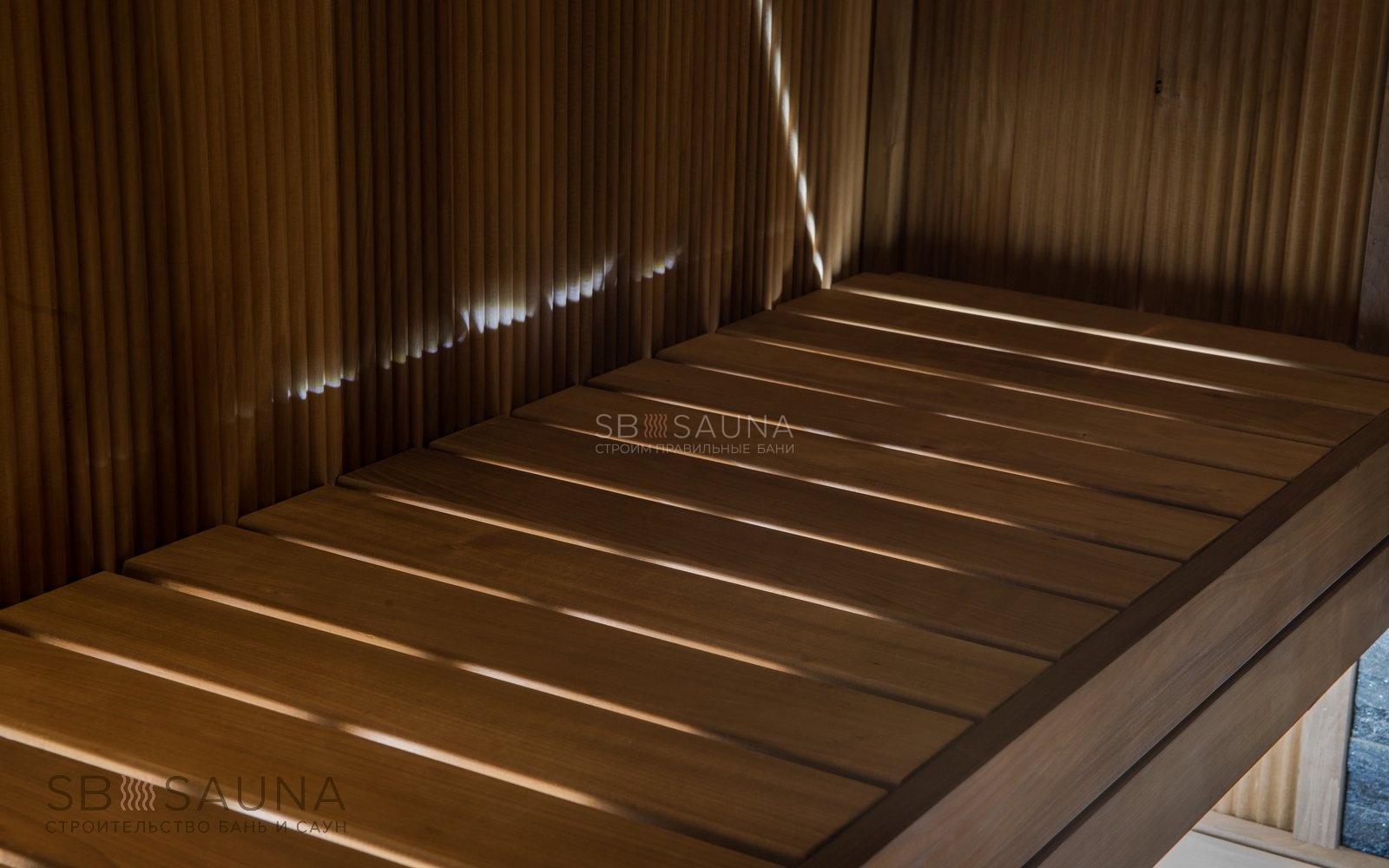 <В дизайне этой парной использовано необычное решение - вагонка-волна из термоосины. Полок выполнен из термоабаша, дерева, которое греется в сауне до самых комфортных для человеческого тела температур.